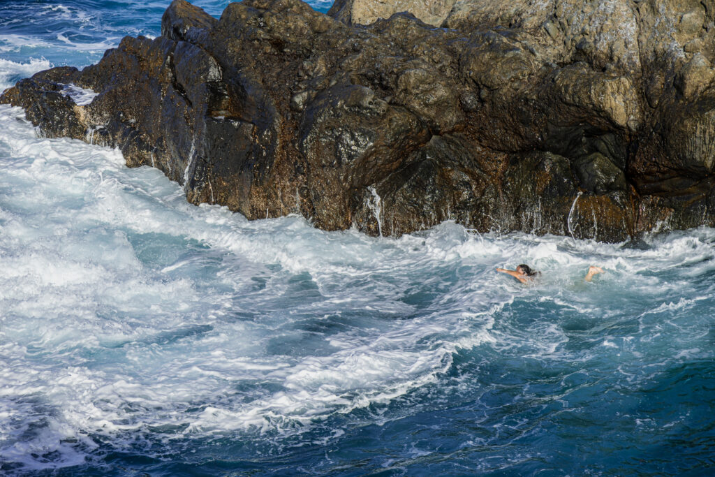 Am văzut că apa s-a agitat, era clar moment de poză. Așteptam să se zdrobească valul de pietre, să prind o poză epică. Doar că în loc să mai fiu atent, am observat că un băiat stătea pe marginea piscinei, la a doua ieșire. A doua ieșire era cumva ne-evidentă… pentru că se afla în zona îndepărtată a oceanului. Te aștepți să vină apa dinspre ocean, nu din spate. Valul era cam cel mai mare pe care l-am văzut… Și a venit……