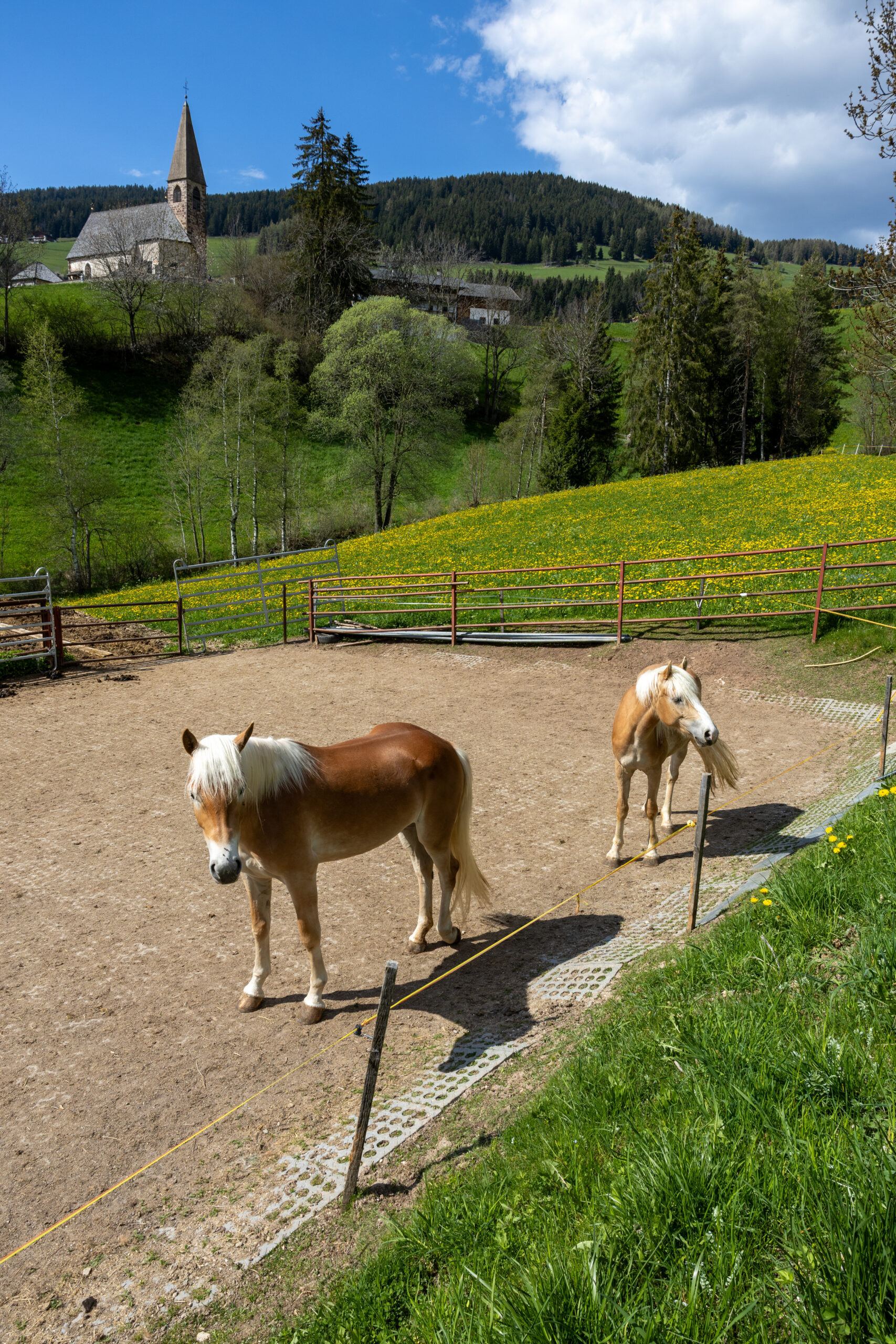Am început traseul omenește, în zonă super turistică , la biserică. Am întâlnit niște ponei super simpatici, niște cai de concurs și cam atât. Era fooaarte puțină lume. Era chiar o slujbă la biserică, dar n-am îndrăznit. Ne-am ținut de traseu. Am urcat, priveliștea devenea din ce în ce mai frumoasă. Santa Magdalena, cu munții în spate și nimic altceva e ceva de stai cu gura căscată. Te minunezi de verdele pur, de perfecțiunea vârfurilor , de seninul cerului, de pădurea deasă. Cine a făcut aici peisajul ăsta, nota 10, foarte frumos a făcut. O fi lucrat cu ChatGPT, că altfel nu-mi explic.