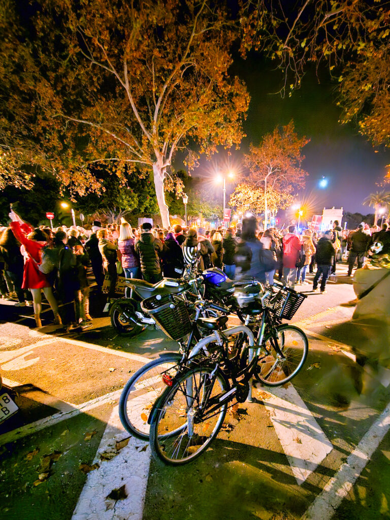 Am stabilit că mergem direct în centru, să mâncăm o paella bună. Până în centru aveam de pedalat vreo 15 minute, pe jos nici nu vreau să mă gândesc. Îndepărtați de parc, se împuținau locurile de parcat bicicleta. Parcă ne era și aiurea să le lăsăm în locuri dubioase, nu de alta, dar ne costa 150 de euro/bicicletă în caz de furt. Am găsit un loc cât de cât safe. Părea lângă niște magazine, cameră de filmat n-am văzut, dar era ceva poliție pe stradă. Nu ni s-a părut nimic suspect. Cu sufletul la gură, am lăsat 300 de euro random pe stradă, după care am fugit la masă. Mâncarea se promitea bună peste tot, dar un restaurant a făcut mai mult cu ochiul. Amuzant e că până la el era absolut totul plin. La el, pustiu. Ciudat, că era extra-ordinar de central. Ne-am și ridicat semne de întrebare, dar n-a fost cazul. Mâncarea a fost excelentă. O paella venețiană și încă o copa de sangria. Pilaf am mâncat, pilaf ne-am făcut. Ne-am hăhăit, i-am judecat pe toți din restaurant. Era o tanti, noi i-am zis babă, dar eram băuți. Și și-a luat baba o salată. Masa era de 4. Toți ceilalți numai friptane și cărnuri, era piesă pe carne aici. Bă, murea baba lângă salatica ei. I-aș fi făcut poze, dar în ce stare eram, nu mi-am permis. Dar când o vedeai, of, cu ce poftă mâncam din paella noastră cu iepuraș și puișor. Mnah, mdeh, am terminat de mâncat. Am lins și un pic din oală (hai că nu la propriu) și am cerut nota. Am plătit, am mai făcut un pipi. De data asta a mai rămas un pic paella în mințile noastre. Și hai să ne recuperăm bicicletele. Ora era târzie, afară beznă, dar te călcai în picioare cu lumea. Câtă lumeeee. Am zis noi că e lume în Sudul Tenerifelor, dar duaaamne. Am uitat cum e un oraș la ore de vârf, în sărbătoare.